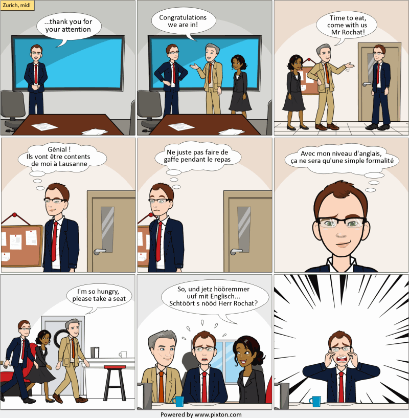 Une histoire vraie et savoureuse : quand M. Rochat, en mission à Zurich, découvre que la langue des affaires change… à la pause de midi.